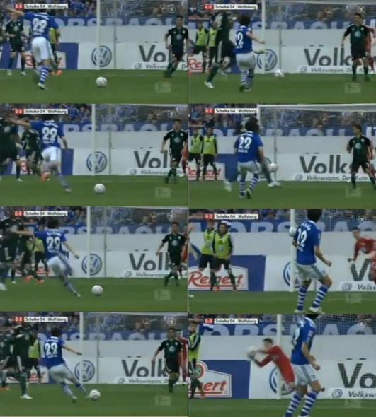 そのめんどくさい場面につながる後半開始6分。DFラインの内田からファルファンへ浮かし気味のパス。シセロを背負いながら胸トラップ。シセロを交しカバーに来たシェーファーを交して突破しようとするところをシセロがファウル(イエロー)で止めます。